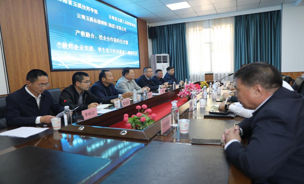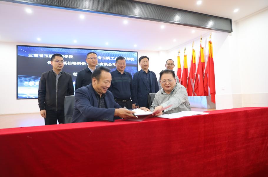 云南玉溪仙福鋼鐵(集團)有限公司李枝官總經理和云南省玉溪技師學院楊寶嘉院長、雙方進行“產教融合、校企合作”簽約。